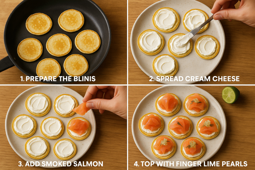12 mini blinis (or small pancakes) 100g cream cheese 150g smoked salmon slices 3 fresh finger limes (color of your choice) Fresh dill for garnish Black pepper to taste